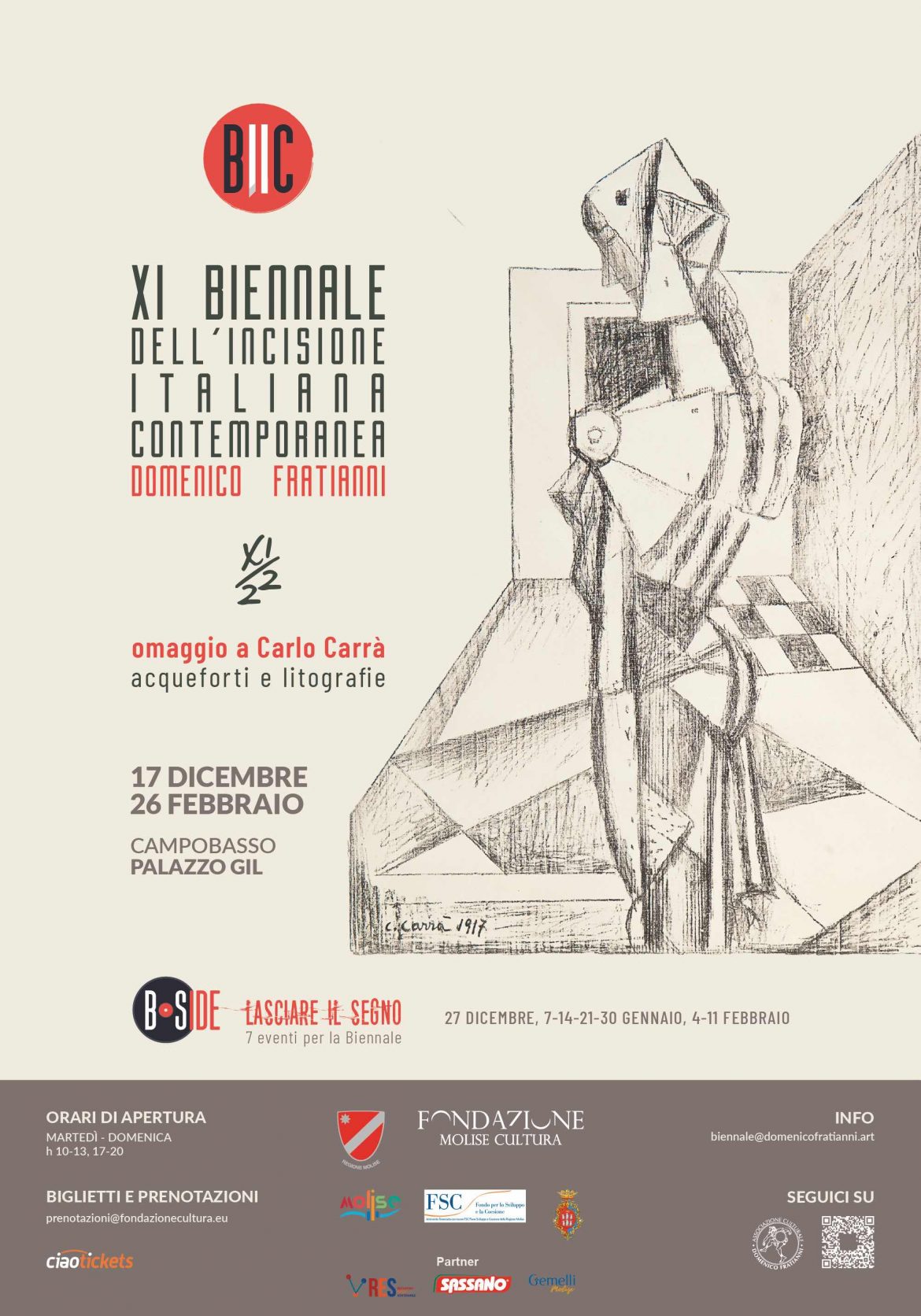 Questa eccezionale presenza è motivo di orgoglio della BIIC, ancora una volta capace di mettere in dialogo gli artisti viventi con i grandi artisti del passato. Insieme a Carrà, la XI Edizione della BIIC esporrà 116 opere di 58 artisti invitati: la Commissione scientifica ha selezionato alcuni tra i maggiori esponenti dell’incisione italiana contemporanea, tra i quali vi è un gruppo di 8 giovani incisori individuati nelle diverse Accademie di Belle Arti nazionali, a testimonianza che la BIIC è particolarmente sensibile alle giovani generazioni di artisti. Ogni partecipante esporrà due opere, per un totale di ca. 110 opere allestite. Per il suo fondatore, il Maestro Domenico Fratianni, la Biennale doveva essere parte di “un’operazione culturale capace di coinvolgere tutti coloro che amano il richiamo dell’Arte” portandoli in Molise, una terra considerata come un “anello di congiunzione tra il Mezzogiorno d’Italia” e il resto del Paese e capace di proiettarsi anche in uno scenario internazionale. Sono degli obiettivi che il Maestro fissò in un testo-manifesto e che, pur fra mille difficoltà, sono stati raggiunti nelle dieci edizioni passate: per esempio, ospitando artisti di Paesi di grande vivacità artistica come la Francia, la Slovenia o la Spagna… Domenico Fratianni, che in gioventù era stato anche docente, ha sempre pensato alla Biennale come ad un elemento di stimolo per il mondo studentesco, in relazione con l’Università del Molise, i Licei artistici e l’Istituto d’Arte. Anche questa edizione vede imprescindibile la figura del curatore Floriano De Santi è critico e storico dell’arte. Il suo lavoro ermeneutico, orientato sull’arte moderna e contemporanea, ma anche aperto sul passato, traduce in una scrittura fertile ed immaginosa una sensibilità ed una conoscenza diretta così delle poetiche come dei dati linguistici e tecnici. Ne fa fede una dichiarazione di Giulio Carlo Argan: “De Santi è tra gli studiosi europei più impegnati e rigorosi della sua generazione”.