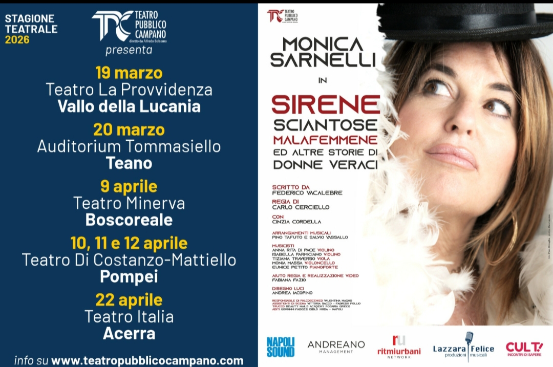 Il Teatro Pubblico Campano, diretto da Alfredo Balsamo, presenta il tour teatrale dello spettacolo “Sirene, sciantose, malafemmene ed altre storie di donne veraci” che vede protagonista Monica Sarnelli, scritto da Federico Vacalebre con la regia di Carlo Cerciello. Lo spettacolo, in un’edizione completamente rinnovata, è prodotto da RitmiUrbani Network, Lazzara Felice, Andreano Management.